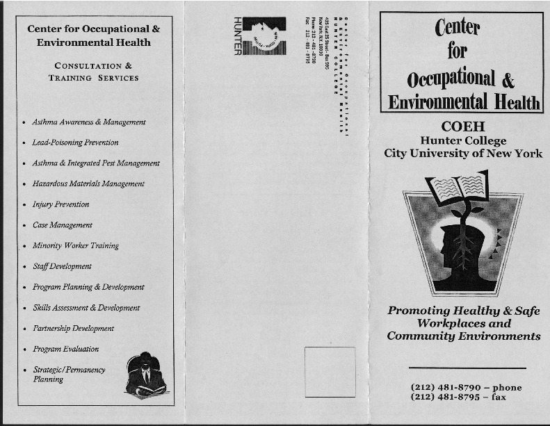This brochure from the early 2000s outlines many of the programs offered by Hunter College's Center for Occupational and Environmental Health (COEH). Included among these were asthma education, community health worker training, and lead poisoning prevention programs. The Center, formally created in 1990, worked with community groups, unions, public employees, CUNY students, and more throughout their many initiatives across New York City and state.