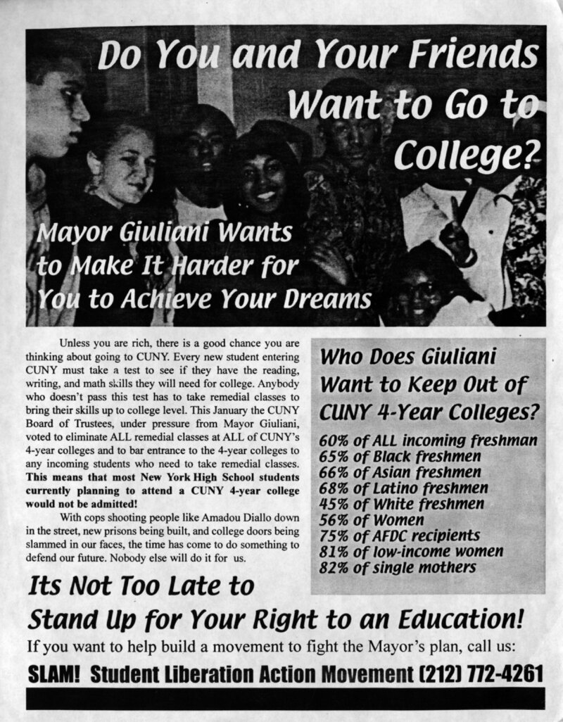 This flier was created by SLAM!'s High School Organizing Committee in 1999 to attempt to recruit high school students to organize to save open admissions at CUNY. Members of the committee passed out these fliers in the morning before school outside Manhattan high schools and asked high school students about their concerns related to access to CUNY.