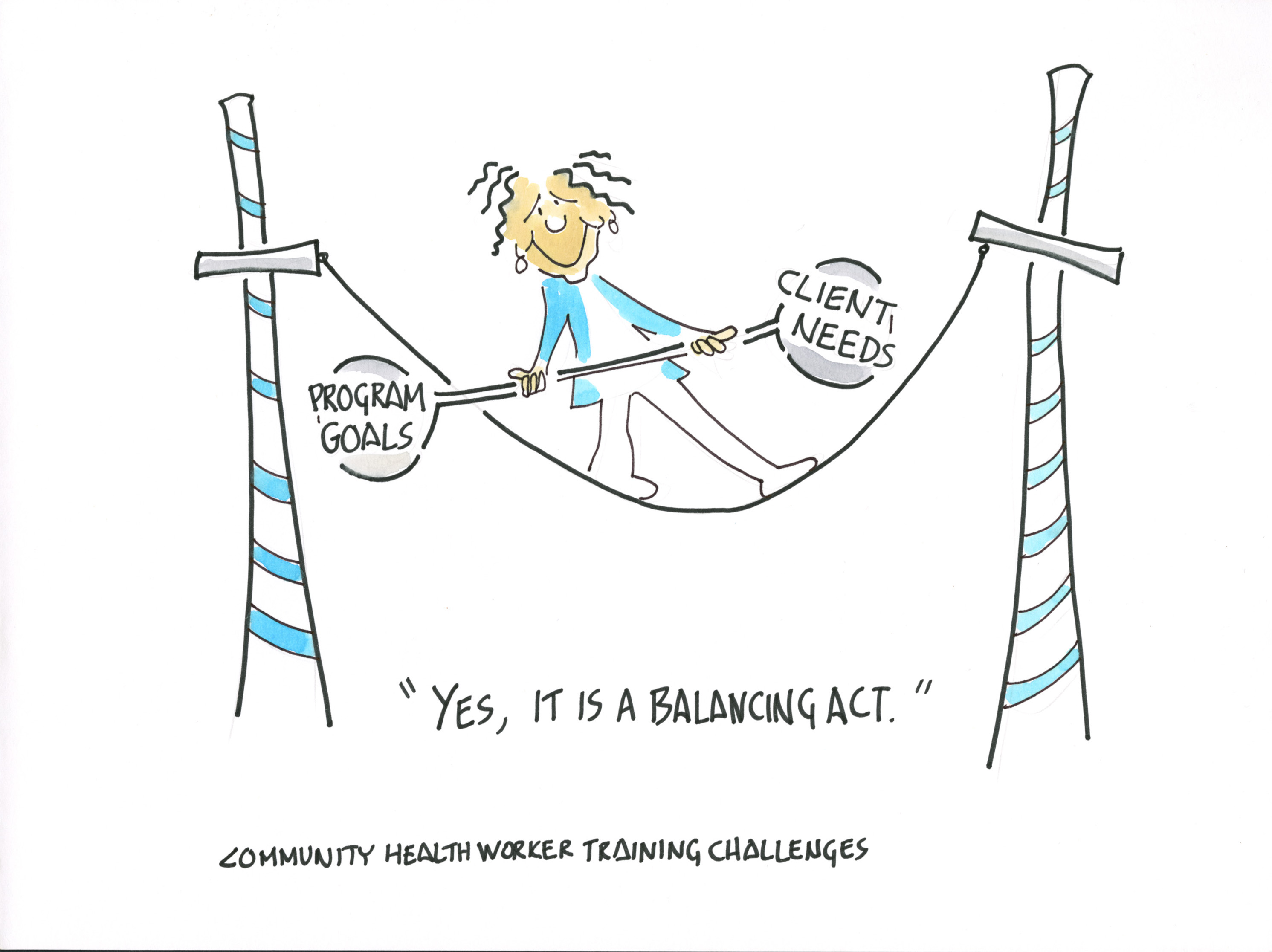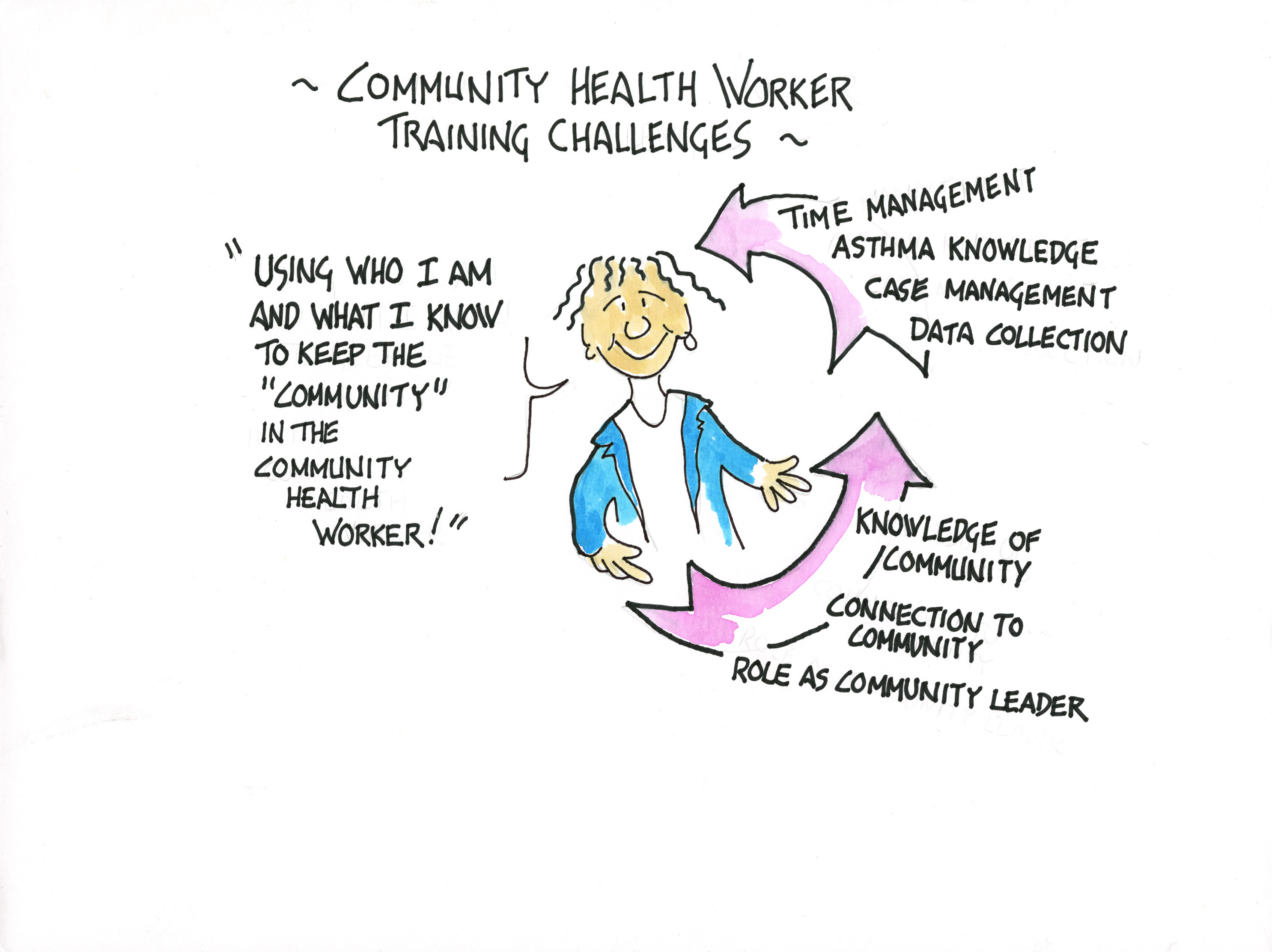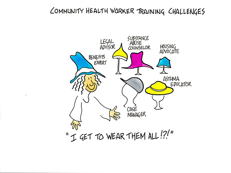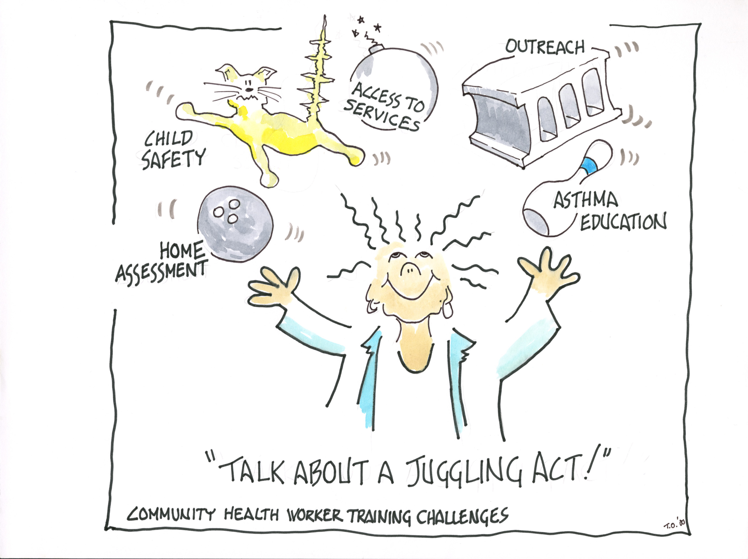 Created in 2000 by Ted Outwater, then associate director and environmental specialist for Hunter College's Center for Occupational and Environmental Health (COEH), these illustrations reflect some of the challenges that faced community health workers. One of COEH's major initiatives, the Community Health Worker Training Program recruited local residents from New York City neighborhoods for an extensive 350-hour curriculum that educated participants on the topic of asthma, its management, assessment, and remediation. Following their training, these health workers where entrusted with providing outreach to their communities, serving as a "vital link between health care providers, community organizations, and the communities they serve." In April 2000, the program commenced with an initial class of 15 health workers from a variety of community groups.