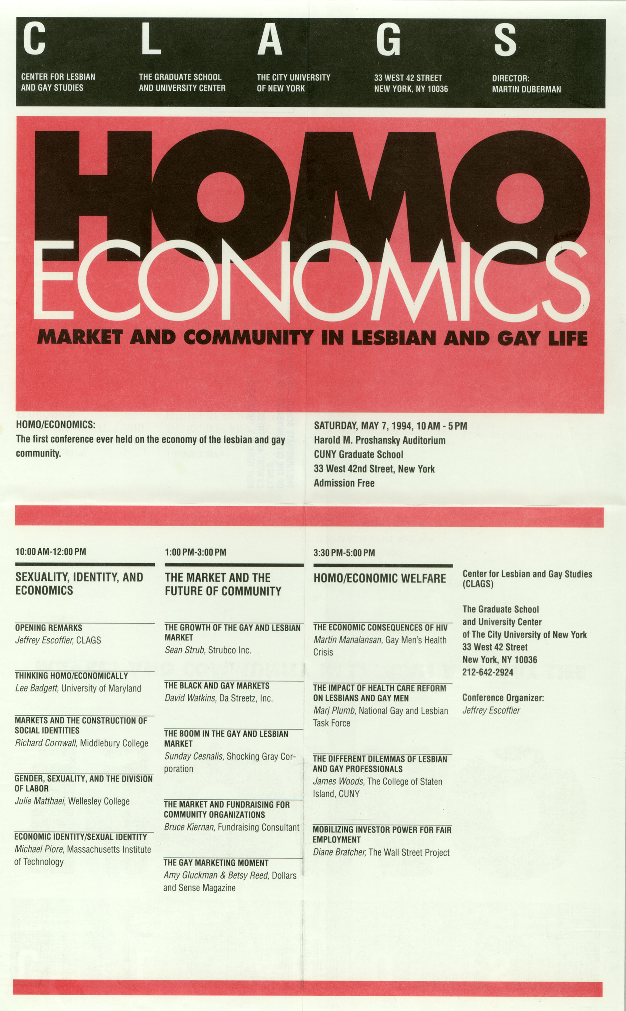 This poster advertises Homo Economics: Market and Community in Lesbian and Gay Life, a conference sponsored by CLAGS and held on May 7th, 1994. Like many other CLAGS events, Homo Economics was groundbreaking in that it was the first ever conference to address the unique economic circumstances faced by lesbian and gay individuals. Participants in the conference came from a number of different backgrounds, including professors, cooperate executives fundraising consultants, the National Gay and Lesbian Task Force, and the Gay Men’s Health Crisis. Some of the topics discussed include explorations of the economic effects of HIV, various conversations concerning “the gay market,” and the lived experiences of gay and lesbian professionals. Although formally instituted at the CUNY Graduate Center in 1991, CLAGS: The Center for LGBTQ Studies was first conceived 5 years earlier by Martin, Duberman, one of the first historians to embrace the, then infantile, field of Queer Studies. Duberman sensed the need for a formal center devoted to queer research. As the first university-based center for LGBTQ research, CLAGS continues to demonstrate its dedication to advancing Queer Studies, by hosting public events showcasing queer research and sponsoring fellowships to support queer scholars. Among its many notable contributions, CLAGS annually puts on at least one major conference and holds the Kessler Award Lecture every fall to celebrate a queer scholar who has made a notable contribution to the field of queer studies.