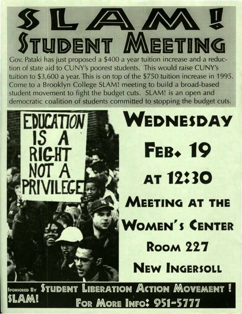 This flier was created by Brooklyn College SLAM! members to promote a meeting on campus to organize protests against a CUNY tuition hike in the spring semester of 1997.