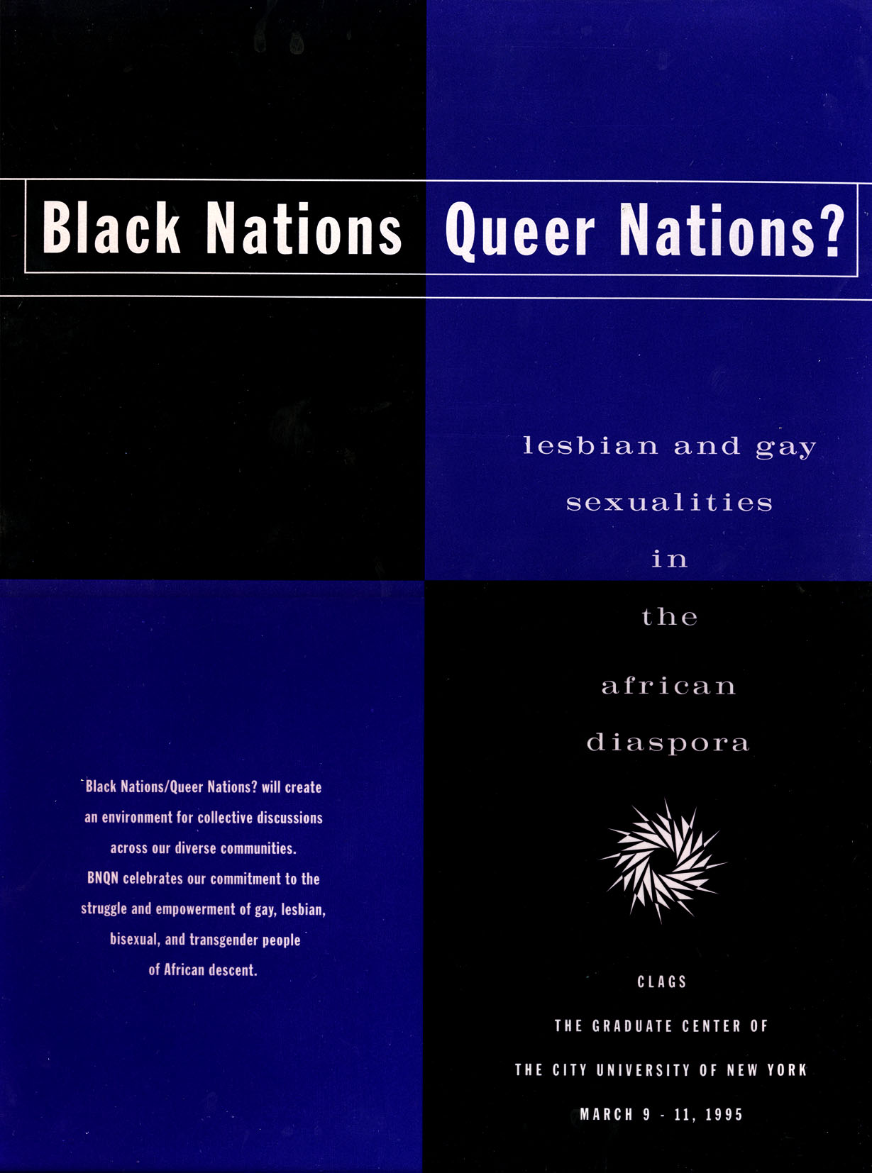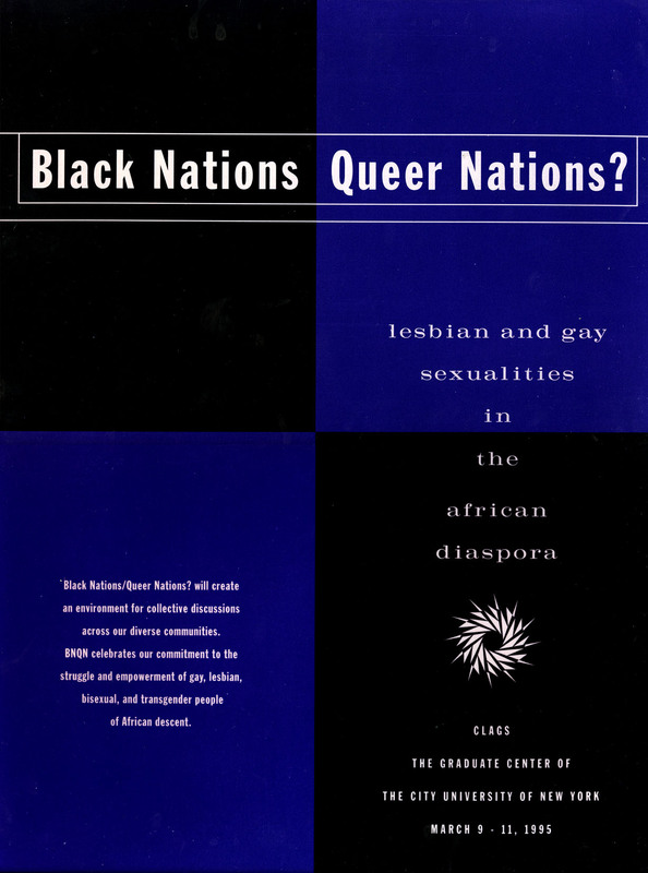 This poster promotes one of the early conferences sponsored by CLAGS, Black Nations/Queer Nations?. The conference was held at the CUNY Graduate Center over the course of three days from March 9th to 11th, 1995. This conference was among the first large-scale events to use an intersectional approach and look at "queerness" and "blackness" together, to discuss the unique experiences of queer individuals of African descent. The conference brought together famed scholars such as Essex Hemphill, Barbara Smith, and Jacqui Alexander to hold seminars and workshops on a variety of topics such as the dynamic interplay of black and queer identities and the prevalence of homophobia among Black communities.