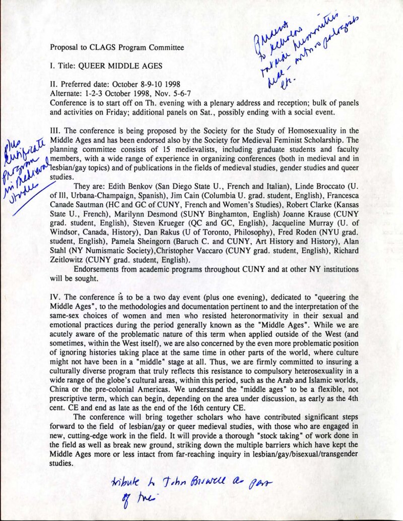 This proposal was written in advance of CLAGS’ Queer Middle Ages conference that was held on November 5-7, 1998. The conference was created by a panel of 15 graduate students and faculty. Perhaps the most notable of whom was Steven Kreuger, a leading Queer Medievalist who teaches in the English Department at Queens College as well as the Graduate Center. This hugely successful conference, held in co-sponsorship with New York University, was the first large-scale conference to focus on the growing academic field of queering the Middle Ages.