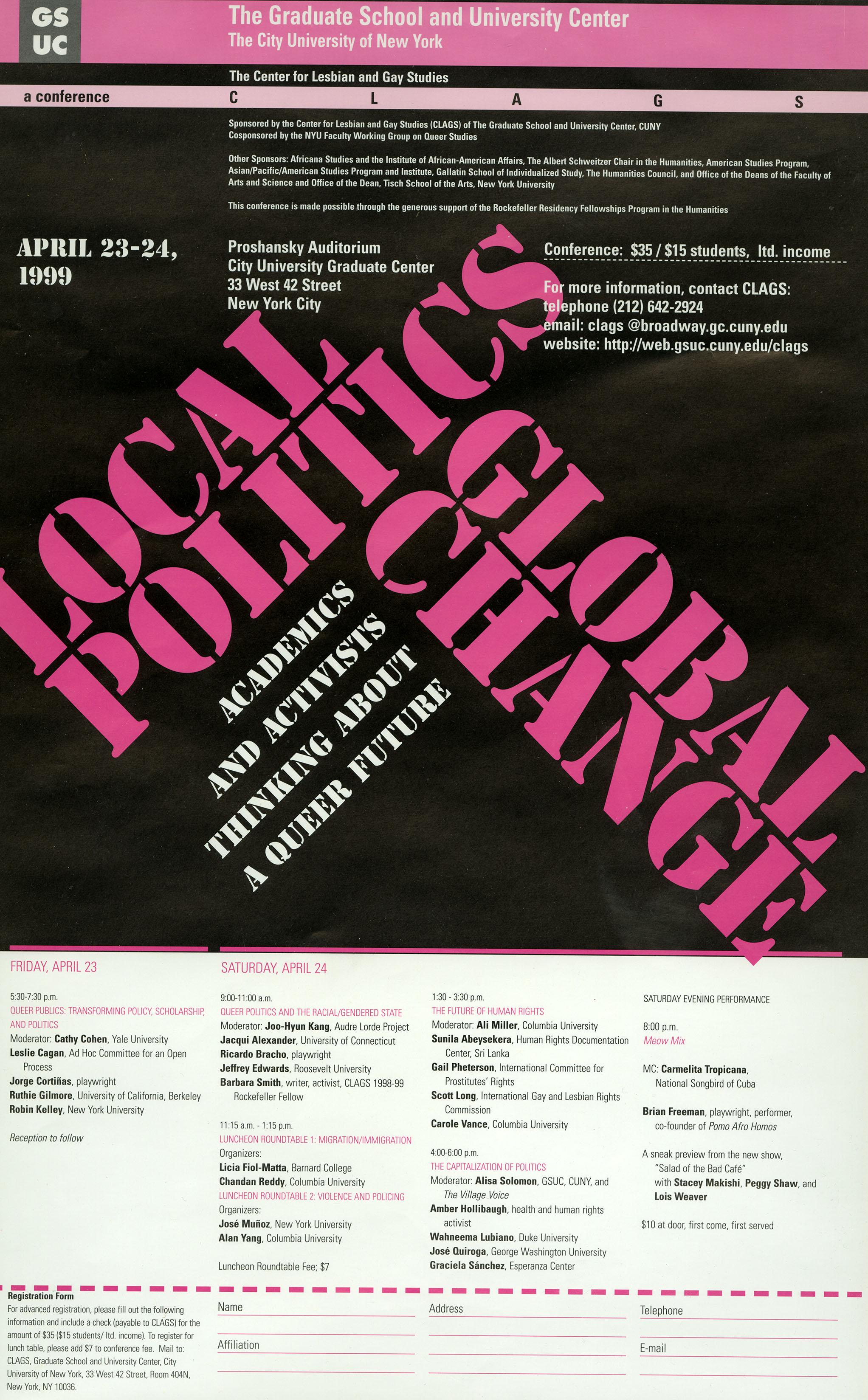 This poster promotes the Local Politics Global Change conference which was held on April 23rd and 24th, 1999 under the sponsorship of CLAGS and the NYU Faculty Working Group on Queer Studies. The central aim of the conference was to explore the possibilities of a queer future as imagined by academics and activists. As part of the conference, Barbara Smith, lesbian and black feminist scholar known for her work with the Combahee River Collective and the founder of Kitchen Table: Women of Color Press, presented on issues of queer politics. José Muñoz presented on Violence and Policing. A decade later, Muñoz went on to publish Cruising Utopia, a critical look at modern queer movements and a call for queer activism beyond assimilationist issues such as marriage equality. Although formally instituted at the CUNY Graduate Center in 1991, CLAGS: The Center for LGBTQ Studies was first conceived 5 years earlier by Martin, Duberman, one of the first historians to embrace the, then infantile, field of Queer Studies. Duberman sensed the need for a formal center devoted to queer research. As the first university-based center for LGBTQ research, CLAGS continues to demonstrate its dedication to advancing Queer Studies, by hosting public events showcasing queer research and sponsoring fellowships to support queer scholars. Among its many notable contributions, CLAGS annually puts on at least one major conference and holds the Kessler Award Lecture every fall to celebrate a queer scholar who has made a notable contribution to the field of queer studies.