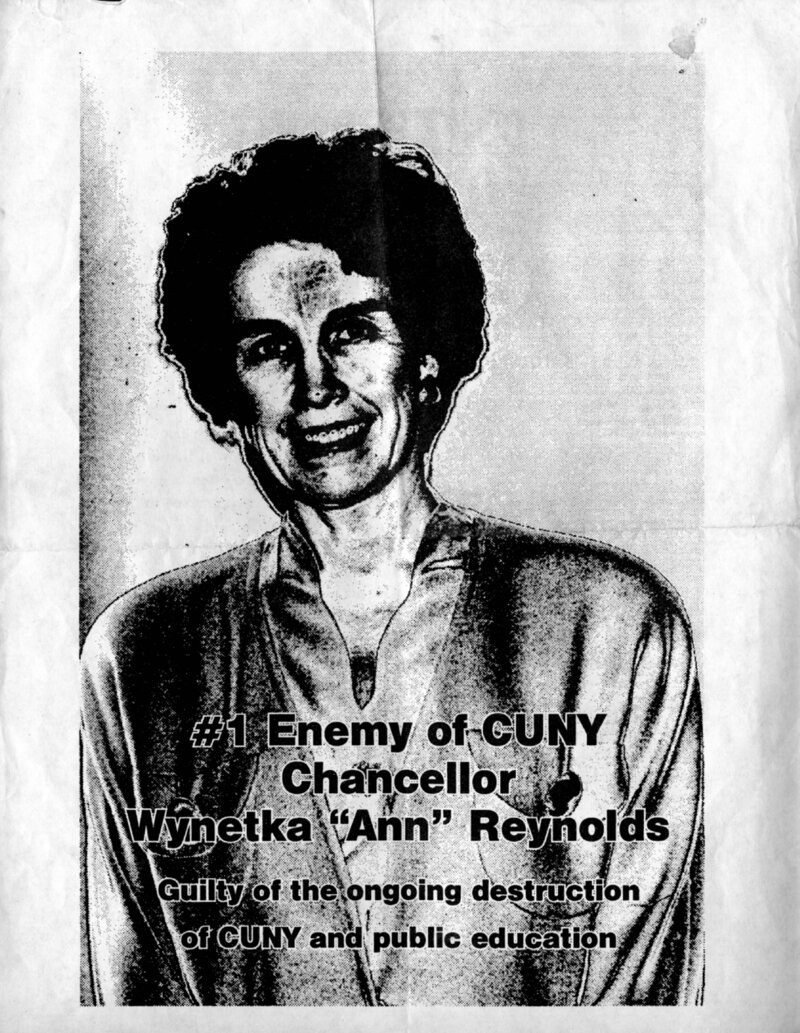 This black and white flier has a picture of Wynetka "Ann" Reynolds, chancellor of CUNY. Activists chose the chancellor as a target to draw attention to their struggle for access to CUNY and quality public education.