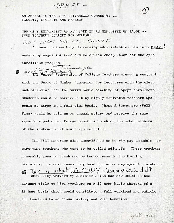 This draft of a 1970 appeal to the CUNY community was written by the United Federation of College Teachers (UFCT). It accused tCUNY of paying teachers "sweatshop wages" with the objective of obtaining cheap labor for the open enrollment program. The document mentioned the hourly pay schedule established for adjuncts (a recently created title), which was intended to compensate people supplementing other full-time careers, and then noted the manner in which the administration was exploiting the Adjunct title for cheap labor. The appeal also described the conversions from lecturer positions to various Adjunct titles not being honored.