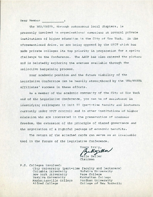 This letter from 1971, signed by Belle Zeller, the chair of the Legislative Conference (LC), was addressed to LC members. It requested that members identify part-time faculty represented by the United Federation of College Teachers (UFCT) who would be "interested in the preservation of academic freedom, the extension of the principle of shared governance and the negotiation of a rightful package of economic benefits." This request was in response to opposition to the LC by the UFCT. During the 1960s, the United Federation of College Teachers (UFCT), and the Legislative Conference (LC) were the two main organizations that advocated for the concerns of CUNY faculty. The UFCT represented part-time faculty and lecturers while the LC was the union of tenured professors. The groups merged in 1972 to form the Professional Staff Congress, which represents CUNY faculty today.