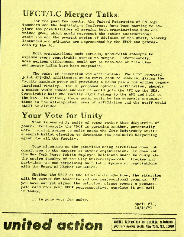 This 1971 memo, written by the United Federation of College Teachers (UFCT), described the merger talks between the UFCT and the Legislative Conference (LC) and the obstacles to consolidation into what would become the Professional Staff Congress. It faulted the LC for advocating "optional" affiliation, which would have allowed union members to join either the American Federation of Teachers (AFT) or the National Education Association (NEA), thereby splitting the faculty union and weakening its bargaining power. The UFCT advocated "joint" affiliation with the two national organizations to provide faculty with a single, unified representative in contract negotiations. During the 1960s, the United Federation of College Teachers (UFCT), and the Legislative Conference (LC) were the two main organizations that advocated for CUNY faculty. The UFCT represented part-time faculty and lecturers while the LC was the union of tenured professors. The groups merged in 1972 to form the Professional Staff Congress, which represents CUNY faculty today.