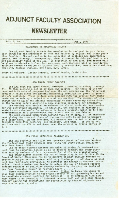 This February 1974 Adjunct Faculty Association newsletter included an announcement of the formation of the Adjunct Faculty Association (AFA), the new organization's formal complaint filed against the Professional Staff Congress (PSC), several longer-form pieces on adjunct labor, and a calendar of events. The newsletter argued that the formal complaint would either force the Professional Staff Congress (PSC) to give fair representation to part-time faculty or allw AFA to establish a claim to PERB that there was no community of interest between full- and part-time faculty, which would establish the foundation for a separate bargaining unit. The newsletter also included "The AFA: a Brief History" by Sylvia Barnes, which claimed that after much discussion the organization ultimately decided that the best policy would be "to attempt to work with and through the PSC" for a contract that would "ensure better treatment of adjuncts."