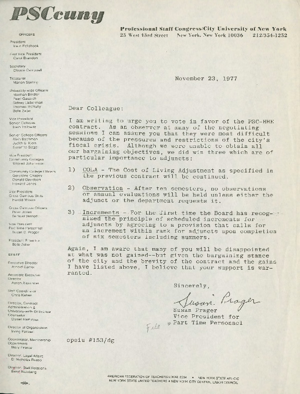 This letter, written by Susan Prager in 1977, urged readers to vote in favor of the Professional Staff Congress - Board of Higher Education (PSC - BHE) contract. While the letter acknowledged that some members would be disappointed, it listed three wins including cost of living adjustments, observation waivers, and scheduled incremental raises after six semesters of employment.