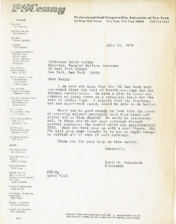 This July 25, 1978 lfrom Professional Staff Congress (PSC) President Irwin Polishook to Professor Ralph Ledley, chairman of the Faculty Welfare Trustees, requested that the Trustees estimate the costs of health coverage for "approximately 2000" uncovered adjunct personnel.