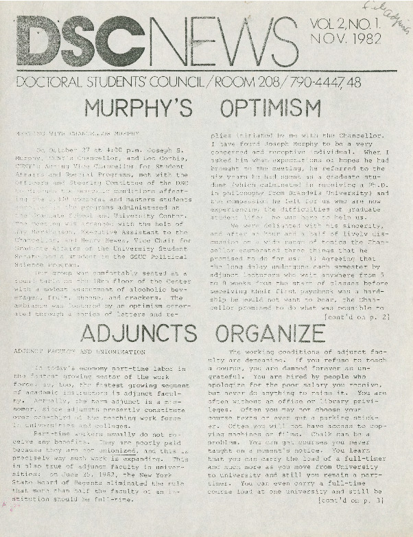 This Doctoral Students’ Council (DSC) newsletter, published in 1982, covered adjunct news that ranged from notes on a meeting the DSC steering committee had with Chancellor Murphy to a satirical piece entitled “How not to be an Adjunct”. The article "Adjuncts Organize" argued that only an independent adjunct faculty union could improve working conditions for adjuncts.The Doctoral Students’ Council, a student organization at the CUNY Graduate Center that actively addressed Adjunct issues, would later launch the Adjunct Project.