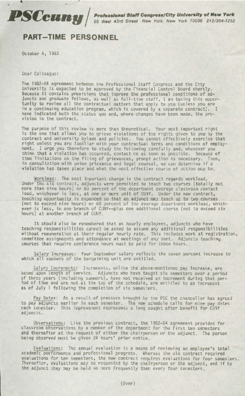 This 1983 Professional Staff Congress (PSC) Part-time Personnel newsletter communicated the 1982-84 contractual agreement between the PSC and CUNY. It advised all adjuncts to understand the contractual language, as that knowledge would allow them to exercise access to the grievance process should they experience any violations. In addition to pay increases, a number of gains were outlined including pay dates, observations, reappointments, travel funds, and leaves.