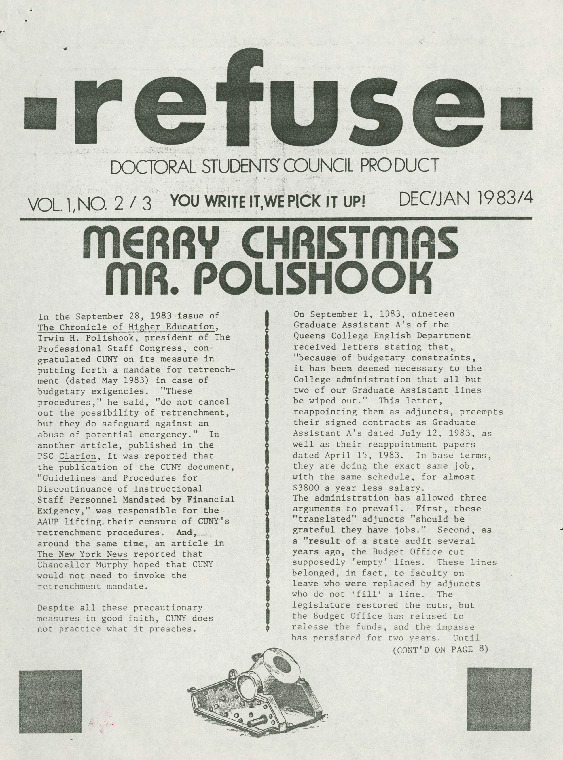 This issue of The Refuse (December 1983-January 1984), a Doctoral Students’ Council newletter, addressed the issue of retrenchment at CUNY, pointing to several articles that had mischaracterized CUNY’s relationship to labor precarity and injustices. In the article “Merry Christmas Mr. Polishook [PSC's president],” Zaccardo and Bunnell unpack the distinction between Graduate Assistant A-lines and adjunct positions, which they claimed in effect amounted to a loss of 3,800 dollars annually per graduate student. Also discussed was the national trend of replacing full-time lines with adjuncts and how that resulted in the further de-professionalizing of the teaching field. The newsletter closed with a call to all graduate students to join the Graduate Student Union (GSU) and provided an agenda for the next meeting, which included discussing a decertification campaign.