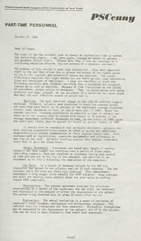 This October 22, 1984 Professional Staff Congress (PSC) Part-time Personnel newsletter reviewed the 1982-84 contractual agreements between the PSC and CUNY. Workloads were described as "the most significant change" and allowed adjunct faculty to teach two courses (not to exceed 9 hours) on one campus and one additional course (not to exceed 6 hours) at a different campus. Additional contract gains included pay dates, observations, reappointments, travel funds, and leaves.