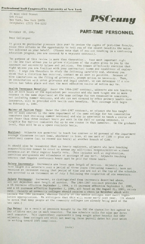 This 1985 Professional Staff Congress (PSC) Part-time Personnel newsletter described the benefits achieved in the PSC-CUNY 1984-1987 contract. Most notably adjuncts who taught six or more hours per semester and at least one course in the same department for at least ten consecutive semesters were eligible to receive health benefits. Additional issues enumerated and described included: tuition remission, workload, salary increases, pay dates, observations, evaluations, and reappointments.