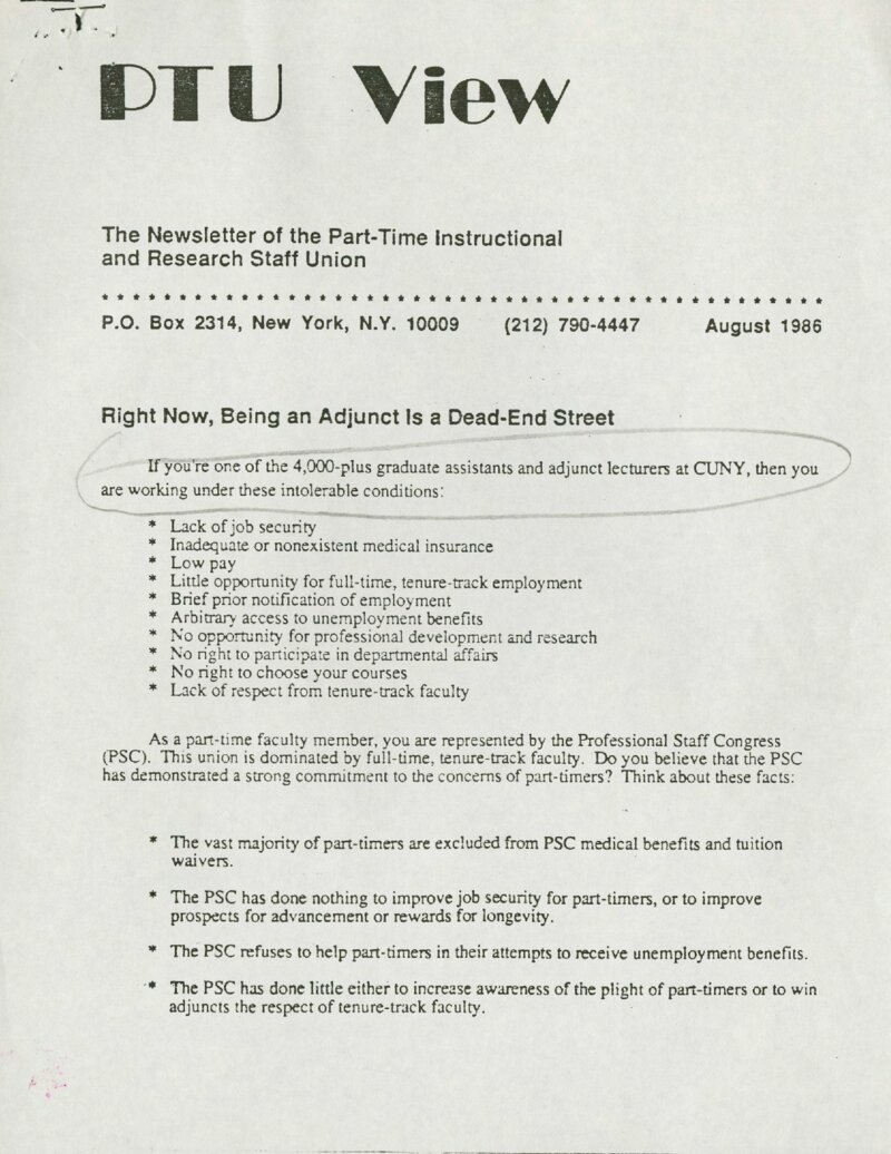 The August 1986 PTU View newsletter called for adjunct faculty to sign a "union authorization" card. In addition to listing how the Professional Staff Congress (PSC) had failed to represent the interests of contingent faculty, the PTU’s demands outlined in the newsletter included comprehensive healthcare, job security, and equal pay for equal work. The Part-time Instructional and Research Staff Union (PTU), although never formally approved as a collective bargaining agent, consisted of a group of graduate students and part-time faculty who felt that it was impossible to improve the working conditions of adjunct faculty without breaking away from the PSC and forming their own union. They filed a PERB request for representation in 1986 that would ultimately fail.