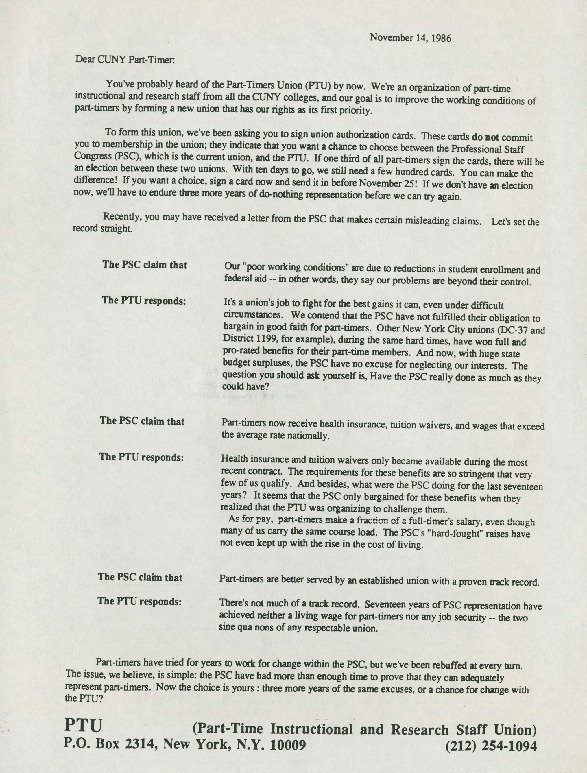 This November 14, 1986 newsletter, written by members of The Part-Time Instructional and Research Staff Union (PTU) and addressed to CUNY part-timers, outlined the PTU's arguments for, and the PSC's arguments against, the certification of a new part-timers' union. A union authorization card was provided.The Part-Time Instructional and Research Staff Union (PTU) was a group of part-time faculty members from across CUNY who challenged the PSC for the right to represent adjuncts.