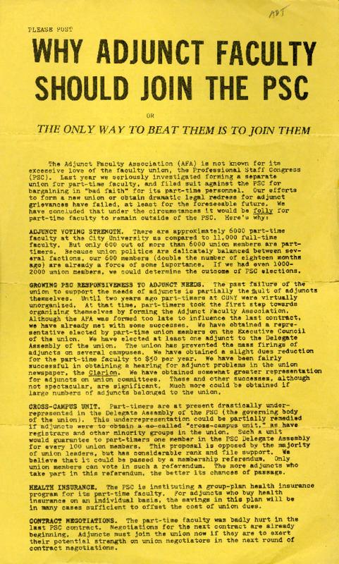 Adjunct Faculty Association. Letter. 1986. “Why Adjunct Faculty Should Join the PSC”, 1986, CUNY DIGITAL HISTORY ARCHIVE, accessed March 10, 2026, https://stephenz.tailc22a4b.ts.net/s/cdha/item/1475