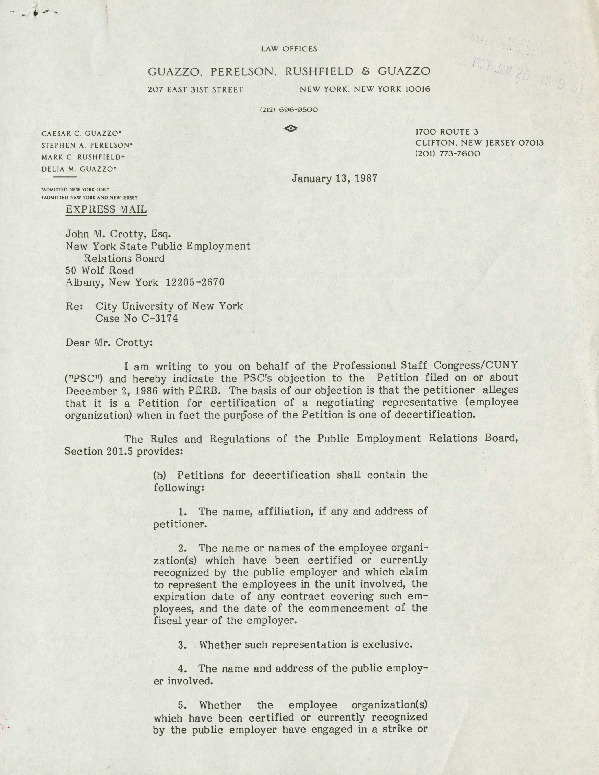 This letter, sent in 1987 from the law offices of Guazzo, Perelson, Rushfield, and Guazzo, to the New York State Public Employment Relations Board (PERB), indicated the Professionals Staff Congress's (PSC) objections to the Part-Time Instructional and Research Staff Union (PTU) petition filed with PERB. The union's objection to the petition was PTU's claim that they were calling for certification when in fact it was a decertification attempt. According to the letter, the petition also omitted a statement offering the reasons for decertification and misrepresented the number of employee signatures. The correspondence requested that the petition be dismissed due to improper filing.The Part-Time Instructional and Research Staff Union (PTU) was a group of part-time faculty members from across CUNY who challenged the PSC for the right to represent adjuncts.