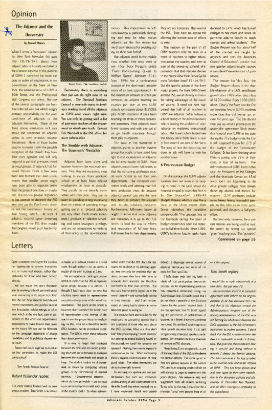 "The Trouble with Adjuncts: The Transients' Mentality", published in The Advocate in 1994 and written by Daniel Mozes, analyzed why adjuncts had traditionally been ineffective in advocating for their own rights. In addition to having lamented the lack of full-time faculty support and the manner in which CUNY disenfranchised contingent labor, Mozes expressed regret at adjuncts' unwillingness to get involved in grassroots struggles to improve their status.
