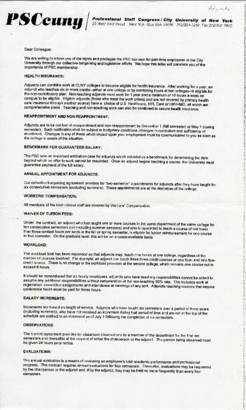 This 1996 memo by the Professional Staff Congress (PSC) staff,enumerated the rights and privileges that adjuncts had gained in the most recent collective bargaining agreement and legislative efforts.