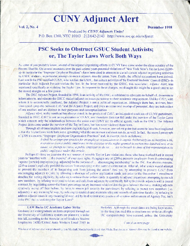 This newsletter, produced by CUNY Adjunct Unite! (CAU), discussed the PSC's alleged accusations against both CAU and The Adjunct Project for violating New York State's Taylor Law. The article argued that CAU is an independent organization and therefore not under the purview of the Taylor law. CAU also accused the PSC of discouraging adjuncts from becoming union members. CUNY Adjuncts Unite! (CAU) , an independent coalition of CUNY part-timers, founded in 1997, produced the CUNY Adjunct Alert newsletter. The Adjunct Project, founded in 1994, was an activity of the Doctoral Student Council (DSC). It was established to advocate on behalf of, to disseminate information to, and to educate Graduate School and University Center (GSUC) student adjuncts on issues pertaining to their academic employment.