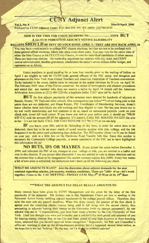 CUNY Adjuncts Unite!. Letter. 2000. “CUNY Adjunct Alert (March April 2000)”, 2000, CUNY DIGITAL HISTORY ARCHIVE, accessed March 10, 2026, https://stephenz.tailc22a4b.ts.net/s/cdha/item/1491