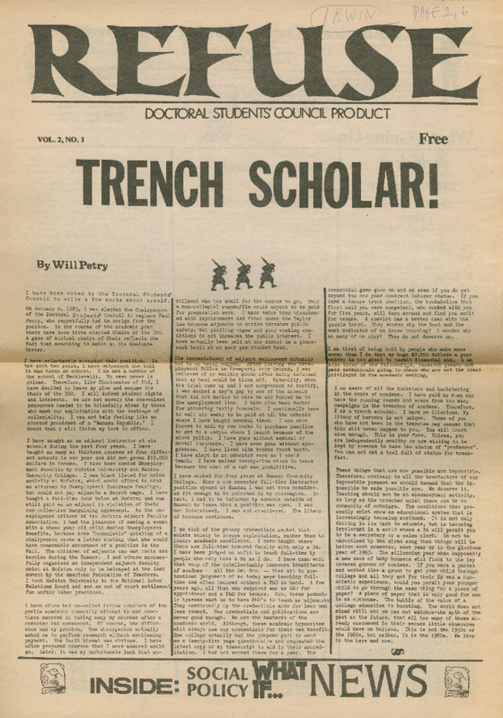 Will Petry, an adjunct who had recently been elected Chairperson of the Doctoral Students' Council (DSC) at the Graduate Center, wrote this 1986 editorial in Refuse. Petry recounted a series of specific events in relation to his employment as an adjunct at Hofstra University and Nassau Community College and lamented the inconsistencies of the “the phony credentials racket,” his inability to receive unemployment benefits, and the sacrifices he has made in order to be able to teach.
