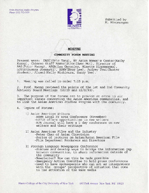 These minutes document the Hunter Asian American Studies Program (AASP)’s third Community Advisory Board meeting which took place on January 18th, 1994. In attendance included representatives from prominent community organizations including the David Wong Support Committee, New York Asian Women's Center, Chinese Staff Association, and Asian American Writers' Workshop. The meeting focused on planning a series of forums that would focus on important issues concerning Asian American communities, including supporting Asian Americans in the arts, labor and immigration issues, and women's issues.