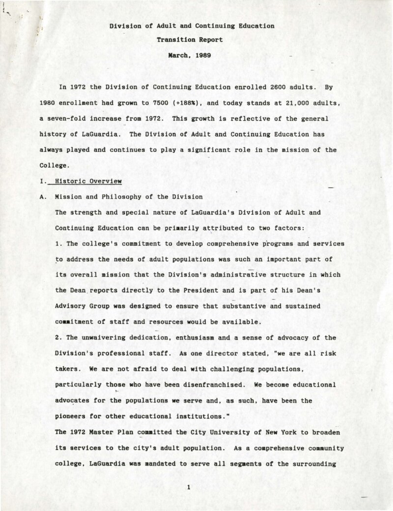 This 1989 report chronicles the growth of the LaGuardia Community College Division of Adult and Continuing Education since its inception in 1972. The report states: "The Division of Adult and Continuing Education was envisioned as a major outreach vehicle to accomplish this mission and, from its inception, has played a pivotal role in enabling the college to fulfill its mission to provide access for non-traditional populations."