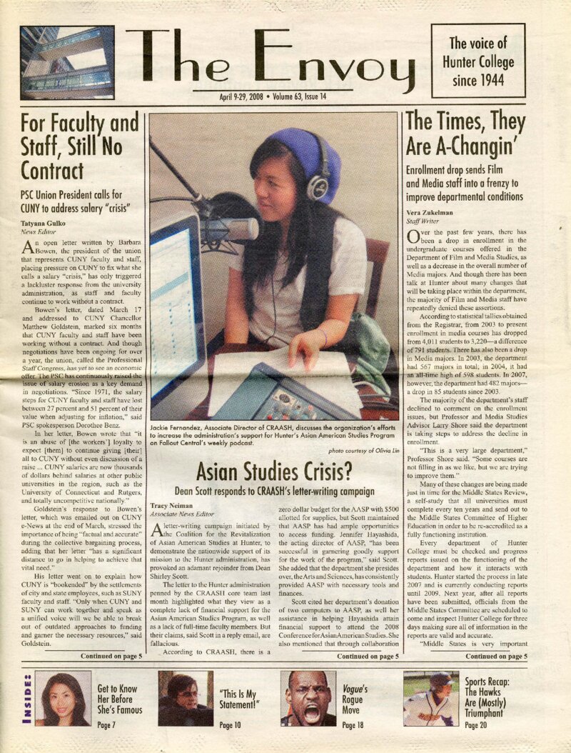 This article in the Hunter Envoy from April 2008 covers Dean Shirley Scott's response to claims made by the Coalition for the Revitalization of Asian American Studies at Hunter (CRAASH) about the lack of financial support from the Hunter administration for the Asian American Studies Program (AASP). Scott cited the program's success in order to disprove the claims and further used the AASP's status as an interdisciplinary program, rather than a free-standing department, to justify the administration's lack of investment. CRAASH insisted that the program's success was a result of efforts by AASP students, faculty, and acting director Jennifer Hayashida, and not the Hunter administration, and also refused Scott's use of the program's status as justification for its present condition.