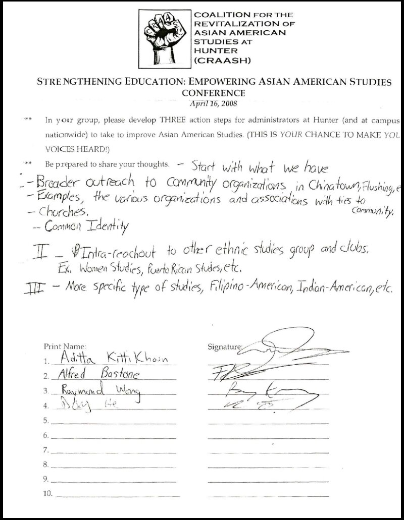These notes come out of a participant workshop at the Strengthening Education: Empowering Asian American Studies Conference hosted by the Coalition for the Revitalization of Asian American Studies at Hunter (CRAASH) on April 16, 2008, to address the need for support for Asian American Studies in higher education. Conference attendees were asked to come up with action steps for administrators to take in order to strengthen the presence and livelihood of Asian American studies at Hunter and universities nationwide.