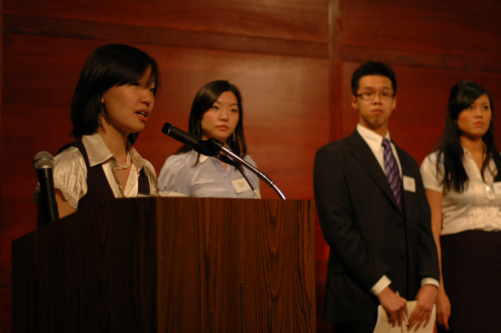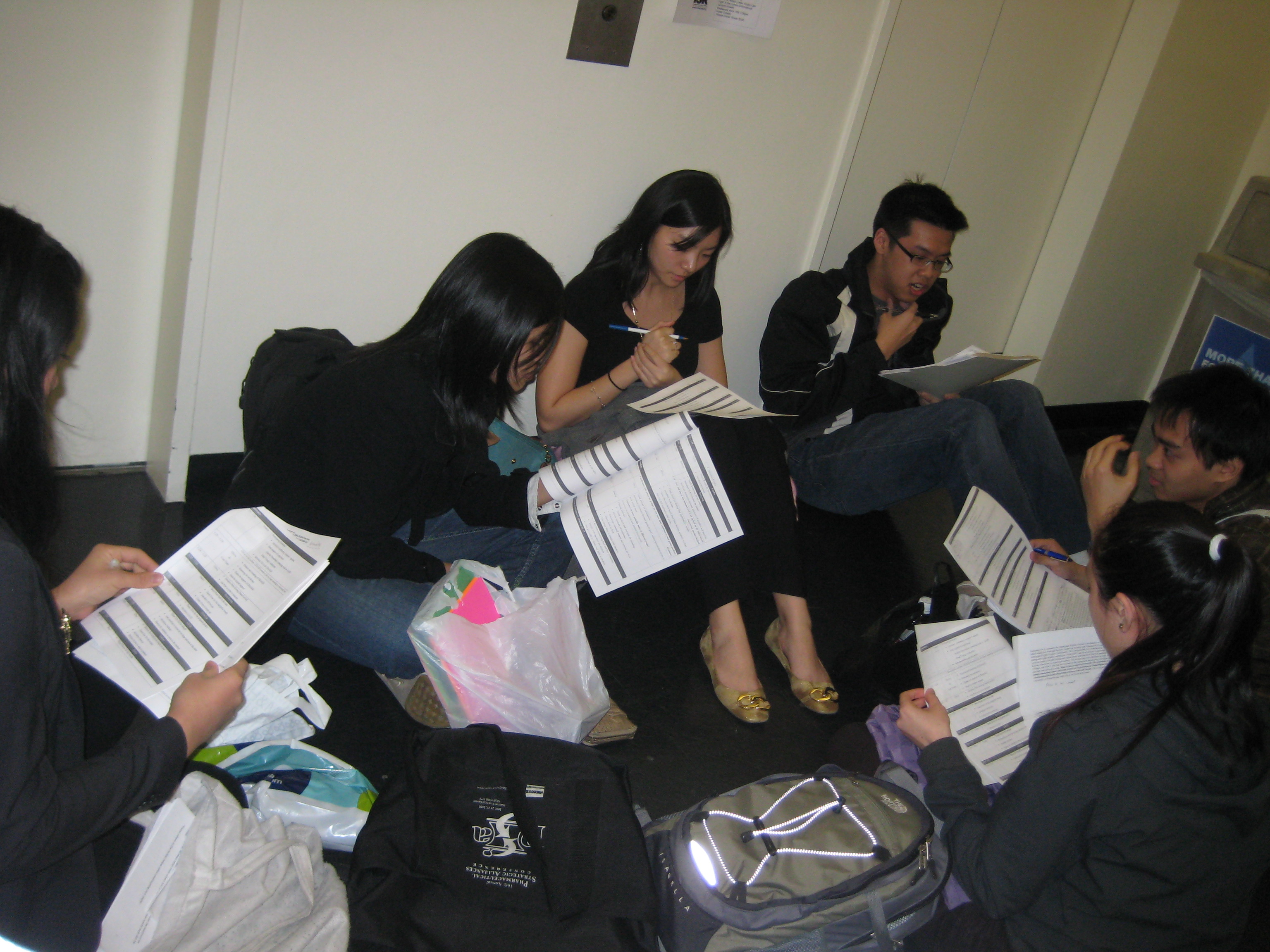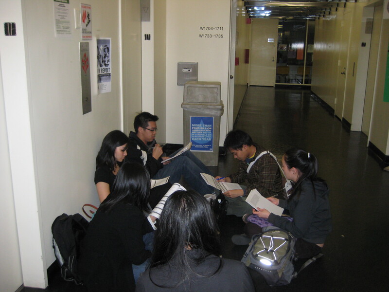 These are a collection of photographs of members of the Coalition for the Revitalization of Asian American Studies at Hunter (CRAASH) taken during the club's early years. From top to bottom, CRAASH members are seen tabling and petitioning in Hunter West, having a meeting on the floor of a hallway, and speaking at their Strengthening Education: Empowering Asian American Studies conference. CRAASH did not begin as a chartered club or organization and therefore did not have access to club space and would meet wherever they could—in the library, in the hallways, and in the dorms. In the last photo, from left to right, are pictured: Olivia Lin, Jessica Lee, Christopher Eng, and Jackie Ng Fernandez.