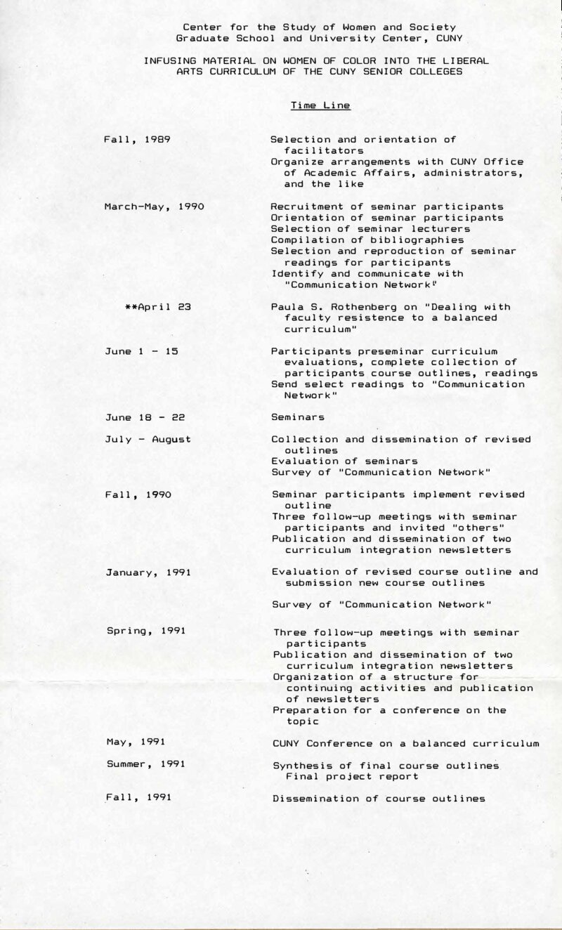 A part of the Ford Foundation grant proposal, this file provided a timeline for implementing the inclusion of material on and by women of color (WOC) into the liberal arts curriculum of the City University of New York (CUNY) senior colleges. The timeline had the project set to begin in the fall of 1989 with the selection and orientation of facilitators, followed by the recruitment and orientation of seminar participants from March to May 1990. That three-month period also included selecting seminar lectures and readings for participants and communication with the "Communication Network." A talk by Paula S. Rothenberg, entitled, "Dealing with Faculty Resistance to a Balanced Curriculum" was scheduled for April 23, 1990. The seminars associated with the project were expected to take place from June 18 to 22, 1990. In July and August, there would be a collection and dissemination of revised outlines for courses, evaluations of the seminars, and a survey for the "Communication Network." By the Fall of 1990, participants were expected to implement revised outlines, attend meetings, and publish two newsletters to integrate WOC material into the curricula. In May 1991, there would be a conference on what was a balanced curriculum. The final product, integrated course outlines, would be disseminated in the fall 1991 semester.