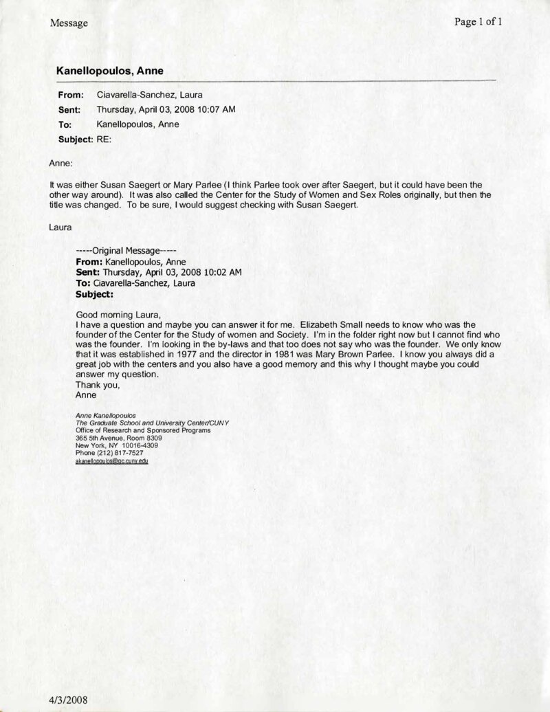 This document provides an email thread that began on March 31, 2008, with Anne Humpherys, part of the Graduate Center's External Review Committee for the Center for the Study of Women and Society (CSWS). In her email, Humpherys stated she was responsible for writing CSWS's history but could not find a list of directors before 1994, when CSWS's director position was combined with the Women's Studies Certificate Program (WSCP) coordinator. Laura Ciavarella-Sanchez, Elizabeth Small, Susan Saegert, Cynthia Epstein, and Anne Kanellopoulos were added to the thread. Finally, though the original director was said to be Mary Brown Parlee, who started in 1979, it was acknowledged that Susan Saegert operationally ran the center from 1977 to 1979. The email thread also revealed that the singular "no" vote on CSWS's creation indicated skepticism and hostility to the fact that such a center was even being considered.