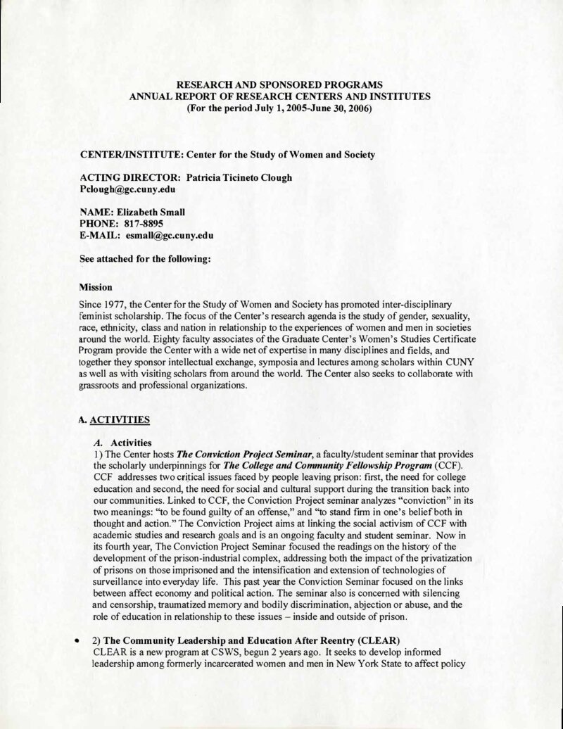 This report described the Center for the Study of Women and Society's (CSWS) research and sponsored programs in the 2005-06 fiscal year. It included the Conviction Project Seminar, the College and Community Fellowship Program, the Community Leadership and Education After Reentry (CLEAR) program, the Activist Women's Voices Oral History Archive, and Urban Fieldwork Internships, the Speaker Series, and international publications. This was followed by plans for the 2005–06 academic year, including journals with Duke University Press. The grants and income section included $15,000 from the City University of New York (CUNY) Vice-Chancellor, $10,000 from the 42nd Street Fund, and about $120,000 that had not yet been awarded. The report closed with the total budget for the 2004-05 fiscal year totaling $14,460 and attachments regarding different publications.