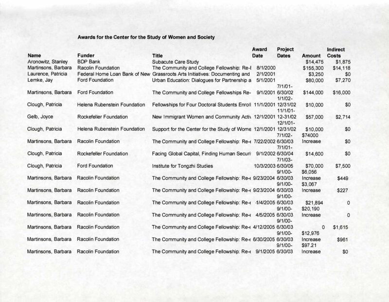 Compiled in 2008, this list included all the financial awards and grants the Center for the Study of Women and Society (CSWS) received for various projects between August 1, 2000, and October 6, 2005. The list contains the names of the people who submitted proposals for the funding, what institution awarded the grant, and how much was awarded. These awards came from BDP Bank, the Racolin Foundation, the Federal Home Loan Bank of New York, the Ford Foundation, the Helena Rubenstein Foundation, and the Rockefeller Foundation. The money supported fellowships, Grassroots Arts Initiatives, Urban Education, and the Institute for Tongzhi Studies, as well as the Community and College Fellowship, which was devoted to helping formerly incarcerated women get college and advanced degrees. The total amount of awards surpassed $696,000.