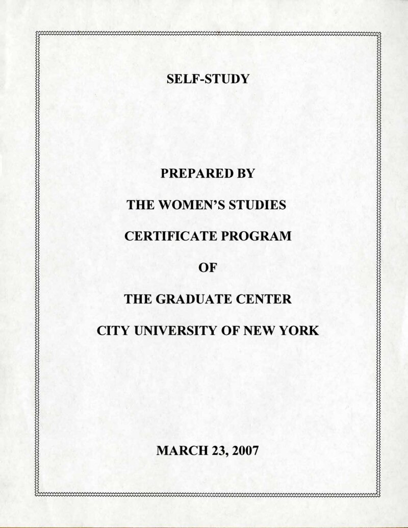 This self study was prepared by the Women's Studies Certificate Program (WSCP) on March 23, 2007. The self study states that WSCP began in 1990 and that its student enrollment had risen steadily from 132 students in the 2001–02 academic year to 227 students in the 2005-06 academic year. These students were drawn from different doctoral programs at the City University of New York (CUNY) Graduate Center, including English, sociology, social-personality psychology, political science, art history, clinical psychology, comparative literature, developmental psychology, history, linguistics, philosophy, social welfare, and urban education. The report identified the program's required courses as "Major Feminist Texts," "Contemporary Feminist Thought," "Proseminar: Multicultural/Transnational Feminisms," "Workshop in Women's Studies," and two electives with a gender component in any field. The study stated that faculty were required to serve on the Advisory Board, develop the semester's Speaker's Series, and present their own work. The external review detailed WSCP's history, providing specific dates for programs and publications resulting from WSCP's efforts. It also described the program's relationship with doctoral programs, library resources, equipment, and facilities and well as information on how the program gave its graduates a competitive edge regarding employment after graduation. The third section of the review focused on issues faced by WSCP, such as the lack of meeting space and the lack of direction when students finished the requirements for the certificate program but did not finish the doctoral program in which they were enrolled.