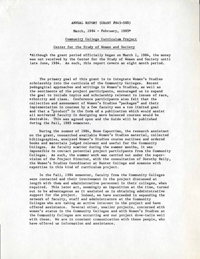This report submitted to the Ford Foundation by the Center for the Study of Women and Society (CSWS) summarizes what CSWS accomplished in the eight months since they received foundation funding. The purpose of the grant was to integrate Women's Studies into the curricula of the City University of New York (CUNY) community colleges, namely Kingsborough Community College, Hostos Community College, LaGuardia Community College, Manhattan Community College, New York City Technical College, Bronx Community College, and Queensborough Community College. Early on in the implementation of the original plan, it was decided that there would be a focus on race, ethnicity, and class and a publication in fall 1985 that would motivate faculty to create more balanced courses. The report detailed the work of Rose Caporrimo in researching Women's Studies material, collecting biographies, and ordering books for the community colleges under the supervision of Prof. Dorothy Helly from CUNY's Hunter College. For the Fall 1984 semester, CSWS contacted faculty at the community colleges and their administrative personnel to discuss their involvement in the project. Rather than creating curricula for specific courses, CSWS decided to focus on topics to accommodate the diversity of courses they found among the various community colleges. The grant also allowed for: 1) the CSWS to: sponsor "Sisterhood is Global: A Symposium on the Changing Status of Women Throughout the World" on November 17 and 18, 1984; 2) an in-house conference titled "Gender and Race at CUNY: Strategies for Change" on May 30, 1985; 3) a newsletter for CSWS members for the spring semester; and 4) the CUNY Feminist Network Directory, to be published in the summer of 1985. The report also requested an extension for the same grant to accommodate the four months lost at the beginning of the grant period since CSWS did not receive the funds from Ford right away. The report ended with an explanation that $1,500 of grant money was used for the "Sisterhood is Global" symposium with permission from the Ford Foundation, and 40% of the grant was to be used for faculty stipends, which would only be paid out in the summer.