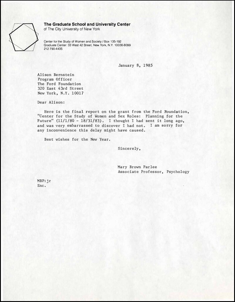 This correspondence from January 8, 1985, provided the final report for the "Center for the Study of Women and Sex Roles: Planning for the Future" grant from the Ford Foundation. The grant, which ran from November 1, 1980 to August 31, 1983, provided the Center for the Study of Women and Society (CSWS) with funds to fulfill the functions it was established to do at its inception. According to the report, the grant allowed CSWS to form the City University of New York (CUNY) Feminist Network, which coordinated activity among faculty and students throughout the twenty-one CUNY campuses. The grant enabled CSWS to facilitate and support women's research and two sets of activities. These included: (1) research and a seminar series with the Mt. Sinai School of Medicine and (2) the aforementioned CUNY Feminist Network, which united the different feminist groups at CUNY. The CUNY Feminist Network met to discuss sex, race, and class in academic, personal, and political spheres. Director of CSWS and author of the report, Mary Brown Parlee, identified CSWS's next goal as expanding the work of the Feminist Network to create real social change.