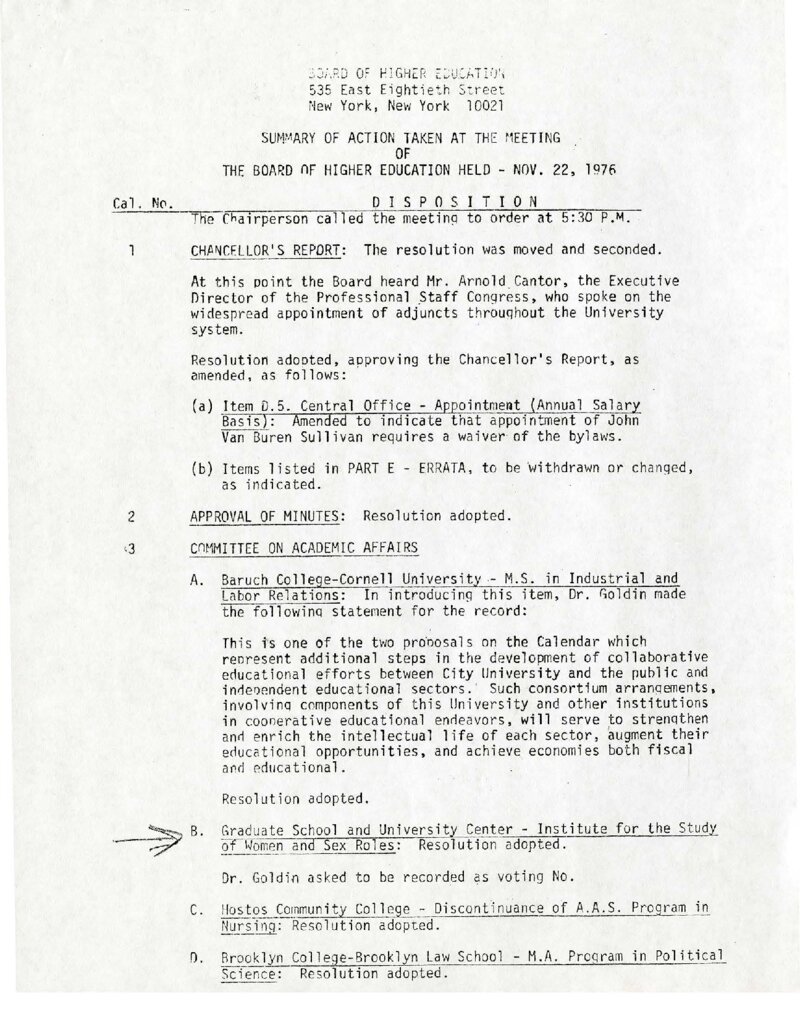 This Summary of Action Taken at the November 22, 1976, Meeting of CUNY's Board of Higher Education contained a report of the approval of the Institute for the Study of Women and Sex Roles, which became the Center for the Study of Women and Society (CSWS). While the Institute was approved, it was noted that psychiatrist and board member, Dr. Gurston D. Goldin, voted against the resolution. This is the type of push back that Susan Saegert and Anne Humpherys discuss in their email regarding the history of the CSWS. The minutes stated that all costs of the Institute were to be covered by outside funding and would not require any new tax levy funding. The Board of Higher Education acknowledged that the Institute would not offer courses or give degrees. Instead, it would promote women's studies, encourage and coordinate CUNY-wide courses related to women's studies, sponsor research in the field, and develop programs in community education on the study of women and sex roles. These minutes included an emphasis on the absence of such an institution in the NYC metropolitan area.
