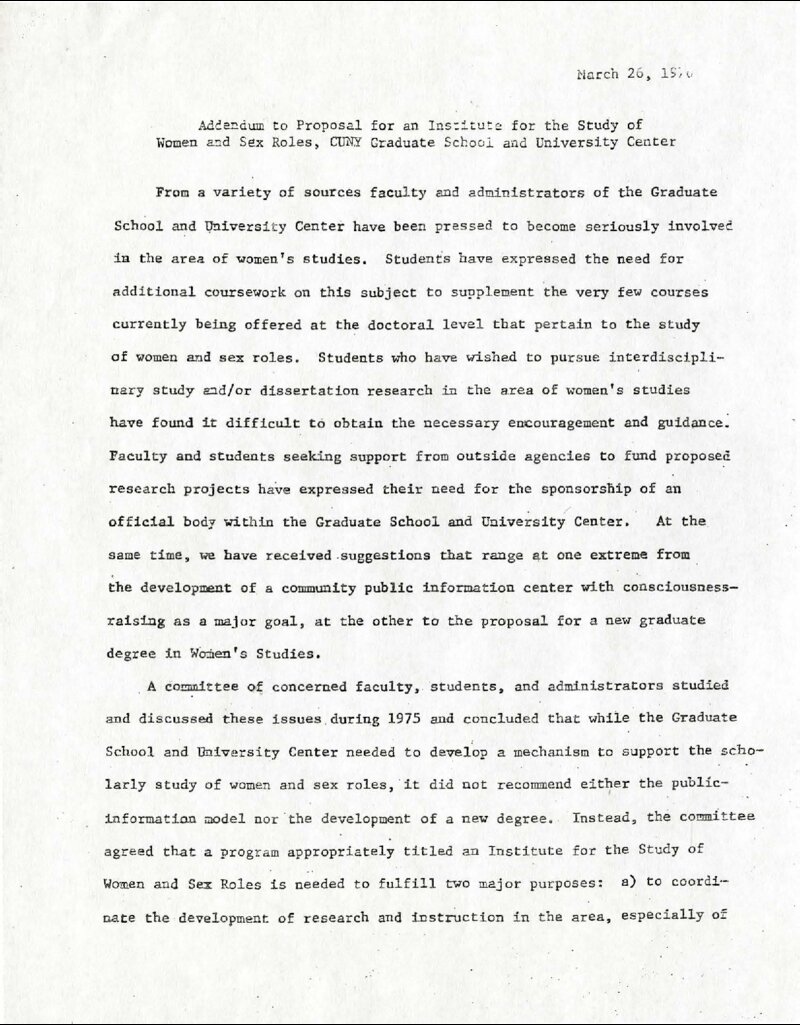 This addendum to the proposal for an Institute for the Study of Women and Sex Roles, which would later become the Center for the Study of Women and Society (CSWS), gave a clearer picture of the Institute's desired role in the CUNY system. Expressed in this document is the need for an official body at the CUNY Graduate School and University Center to encourage and guide students looking to do research in women's studies and fund proposed faculty research projects. The document also clarified that this Institute would not develop a community public information center or create a new women's studies degree. The document outlined the next steps for creating the Institute as being approved, having a director appointed by the Graduate Studies and University Center's President, and conducting an evaluation a year later to better plan for subsequent years.