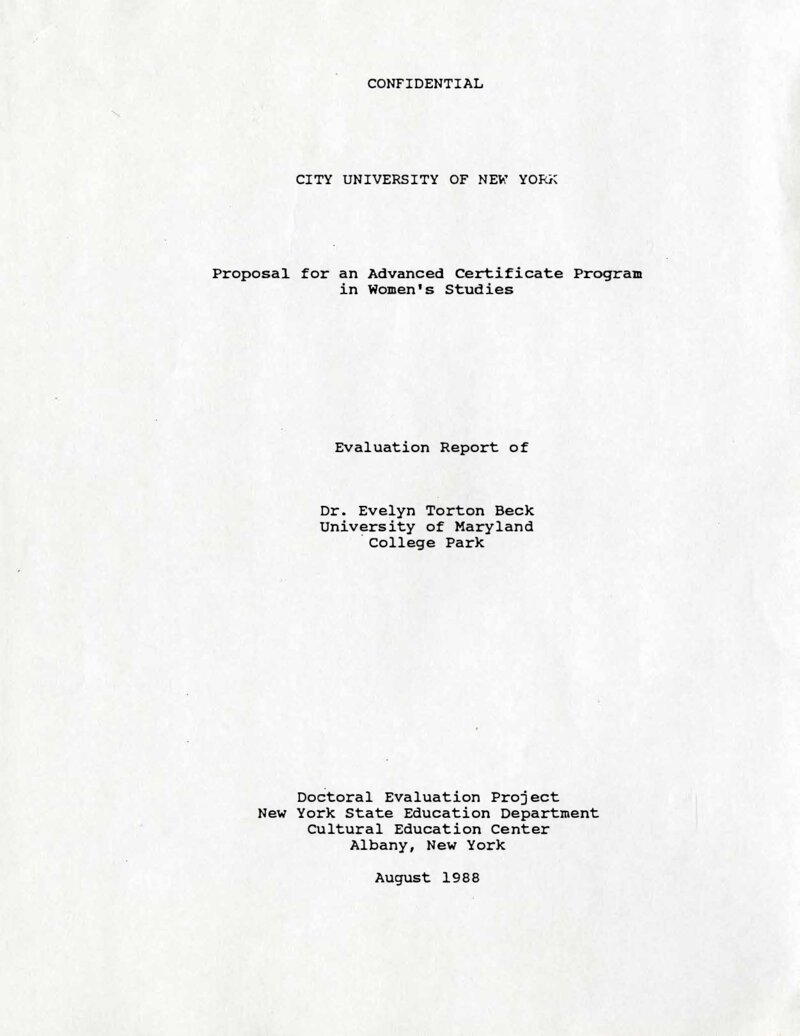 This review of the Advanced Certificate Program in Women's Studies Proposal from August 1988 reiterated the need and importance of such a program at the City University of New York (CUNY). Dr. Evelyn Torton Beck wrote that the proposed program had all the necessary components to be successful: a good balance of core and individualized courses; thirty faculty from various doctorate programs at the Graduate School and University Center (Graduate Center) among the most productive and respected in their fields; high demand for such a program and qualified graduates with such certification; and the ability for implementation without additional resources. This report was completed for the New York State Education Department Cultural Education Center and identified the certificate program as a much-needed and long overdue addition to CUNY.