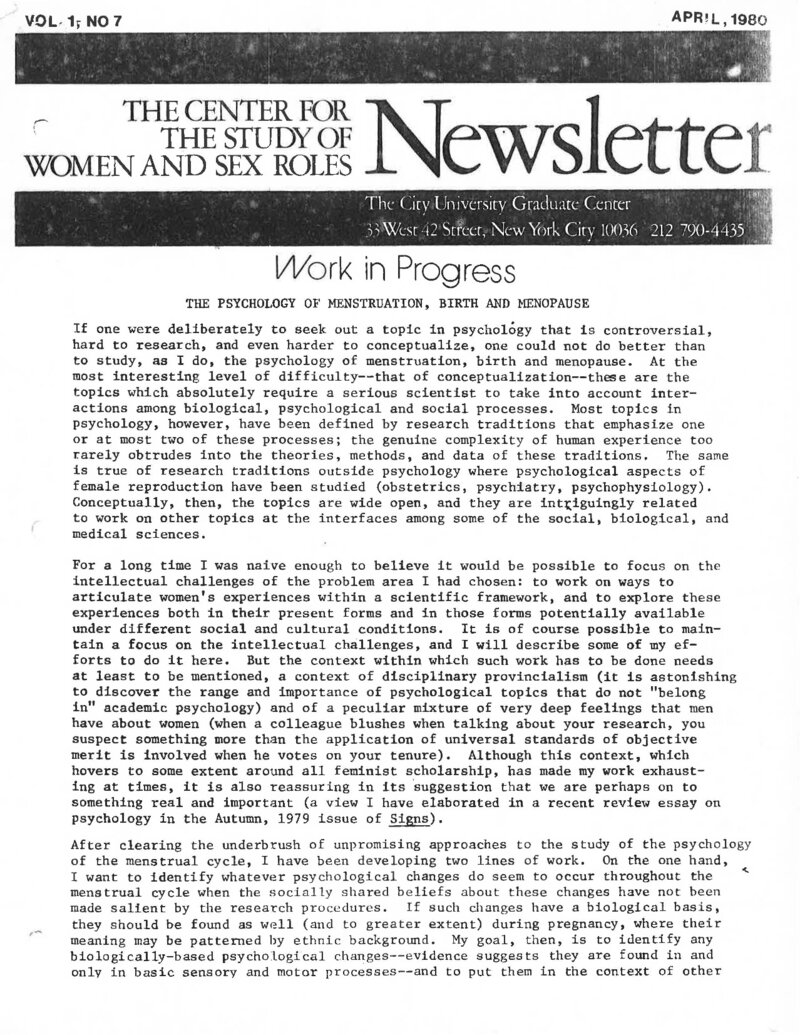 The April 1980 Newsletter from the Center for the Study of Women and Sex Roles – now the Center for the Study of Women and Society (CSWS) – began with a note from the director, Mary Brown Parlee, where she discussed her research on the connection between biological, psychological, and social processes, particularly around menstruation. The "Work in Progress" section reported on Gaye Tuchman's social history of women writers and artists, which was followed by an advertisement for Rayna Rapp's talk on "Thinking About Sex as a Social Relationship." Also included were announcements for upcoming fellowships, research opportunities, a part-time position, lectures, workshops, and conferences. This Newsletter also reported on the Asian American Women's Conference, which aimed to identify the educational problems Asian/Pacific American women faced; develop strategies to work with the nation's educational systems to address the issues, and plans to report on those findings at the next national conference. The Newsletter closed with a list of the Center's events for April 1980.
