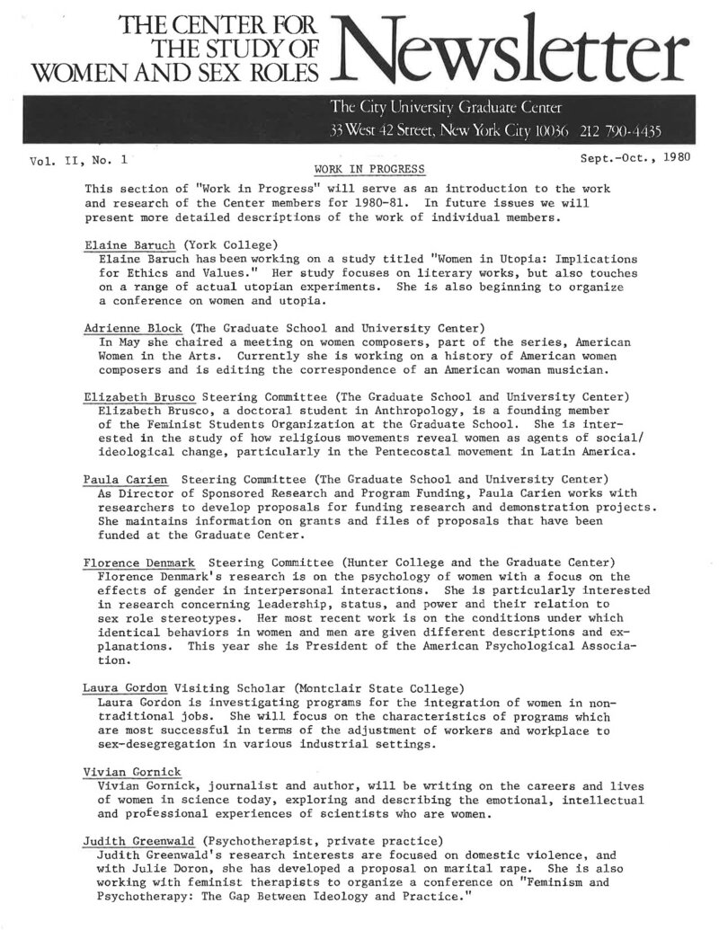 This 1980 issue of the Newsletter by Center for the Study of Women and Sex Roles - now the Center for the Study of Women and Society (CSWS) - dedicated its "Work in Progress" section to introduce the research twenty-six of its members would be engaged in during the 1980-1981 academic year. Its "Notes and Announcements" section included information on the International Congress of Psychology, information on the Sociologists for Women in Society, the New York Chapter of the Association for Women in Psychology, and submission information for the Research on Women in Education Award. Women's Studies courses offered at CUNY's Graduate Center in the Fall semester of 1980 followed. Also provided were information on the Women and Urban Environments Study Group, the Women and Health Research Group, the Feminist Methods of Inquiry Seminar, and the announcement of a training grant on the sociology and economics of women and work. The Newsletter closed with the list of events the Center was sponsoring for September and October 1980.
