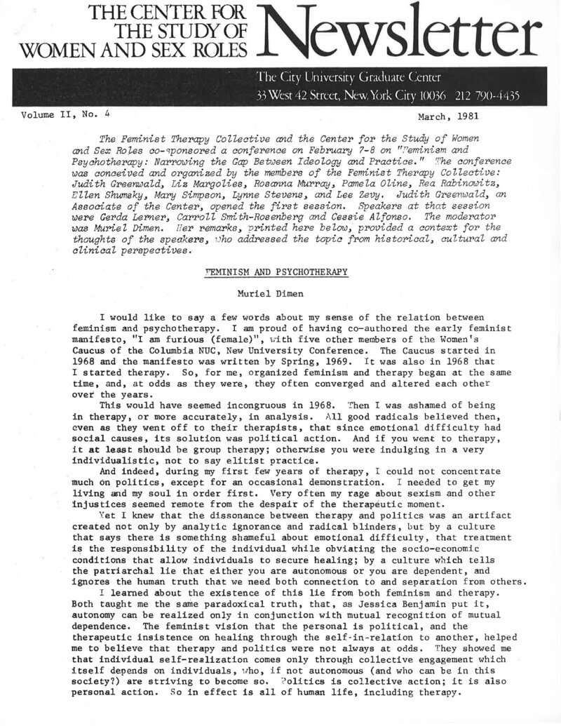 This issue of the Newsletter dated March 1st, 1981 by the Center for the Study of Women and Sex Roles – now the Center for the Study of Women and Society (CSWS) – opened with Muriel Dimen's remarks from the "Feminism and Psychotherapy: Narrowing the Gap Between Ideology and Practice" conference co-sponsored by the Feminist Therapy Collective and the Center for the Study of Women and Sex Roles. The remarks provided context for the conference's focus: the relationship between feminism, political activism, and individual and group therapy. News concerning the Center's upcoming Newsletter, grants, educational televisions series program, an upcoming institute, and the creation of the Center for Feminism and Psychotherapy followed. The Center solicited monetary support for the Newsletter due to the Center's growth and 50% more subscriptions. The Newsletter then listed events the Center was sponsoring and announced external events and opportunities of interest to Center members. The Newsletter closes with a book review of Sokoloff's publications written by June Nash from CUNY City College's Anthropology Department.