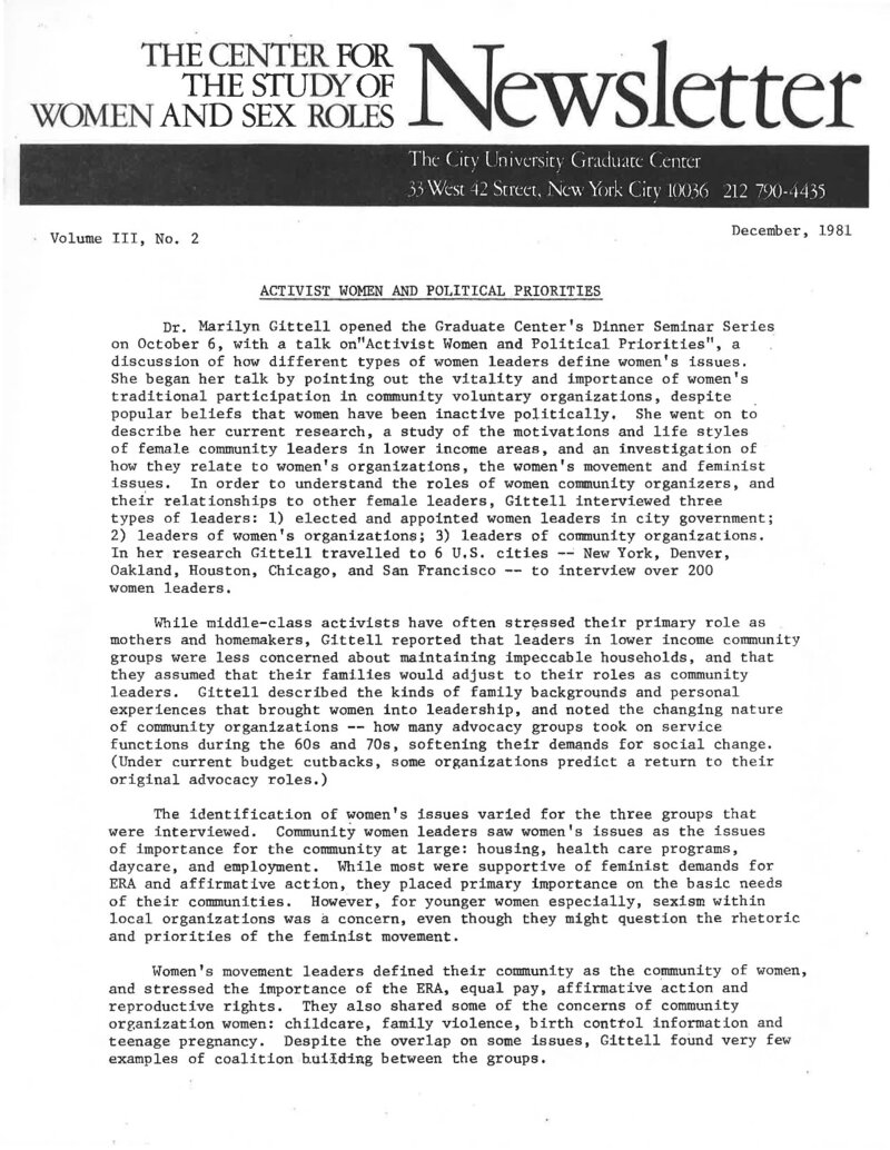 The Center for the Study of Women and Society's (CSWS) 1981 Newsletter began with a report on Dr. Marilyn Gittell's talk on October 6, 1981, called "Activist Women and Political Priorities." This talk discussed how different types of women leaders defined women's issues. Dr. Gittell's research studied the motivations and lifestyles of female community leaders in lower-income areas and how they relate to women's organizations, the women's movement, and feminist issues. The talk concluded with the possibility of coalition-building among different groups to overcome class and race differences. The Newsletter continued with an invitation to the Center's holiday party on December 14 at 4 PM in the Center's new office, followed by calls for papers, various conferences, a symposium, and a rally. Dr. Eleanor Leacock reviewed "Comparative Perspectives of Third World Women: The Impact of Race, Sex, and Class" by Beverly Lindsay, and Ann Saltzman reviewed "Women of Spirit: Female Leadership in the Jewish and Christian Traditions" by Rosemary Ruether and Eleanor McLaughlin. The Newsletter closes with announcements for upcoming conferences, lecture series, colloquiums, submissions, fellowships, and updates on other publications.