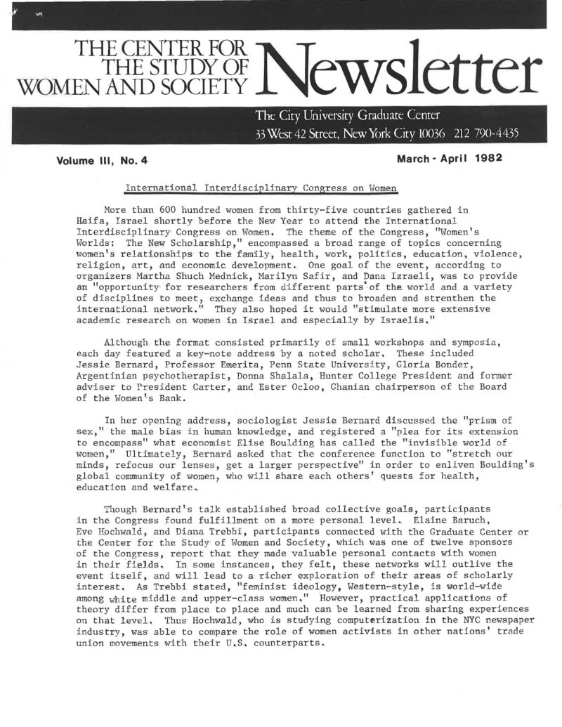 The Center for the Study of Women and Society's (CSWS) 1982 Newsletter was the first issue to feature the Center's current name; previous issues had all used "the Center for the Study of Women and Sex Roles." The Newsletter opened with a report on the International Interdisciplinary Congress on Women, held in December 1981 in Haifa, Israel, where more than 600 women from 35 countries attended. The Congress's theme "Women's Worlds; The New Scholarship" aimed at providing an opportunity for international and interdisciplinary conversations that would, in turn, spark an interest in the research of Israeli women by Israelis. The Center was one of 12 sponsors for the Congress, and some of its members could attend. The report on the International Interdisciplinary Congress on Women was followed by announcements from the Women Office Workers group, on the Equal Rights Amendment, from the Committee for Abortion and Against Sterilization Abuse, and for a demonstration for International Women's Day. Announcements for a workshop about the effects of technology on the work of secretaries, a 13-part series by the Sisterhood of Black Single Mothers, and other conferences, lectures were followed by calls for papers, publications that were of interest to Center members. The last section of the Newsletter, Rosemary Deem, reviewed "Schooling for Women's Work" by Dr. Beatrice Kachuck and a letter to the editor.