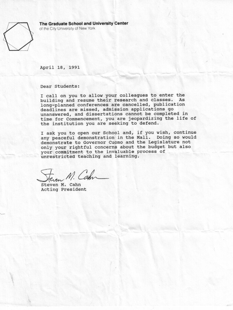 Addressed to the students on April 18, 1991, and signed by Steven M. Cahn, the acting Graduate Center president, this letter stated that the student strikers who had occupied the Graduate Center were "jeopardizing the life of the institution" they were "trying to defend." Cahn insisted that allowing students, faculty, and staff to freely enter the building would demonstrate the strikers' "commitment to the invaluable process of unrestricted teaching and learning."